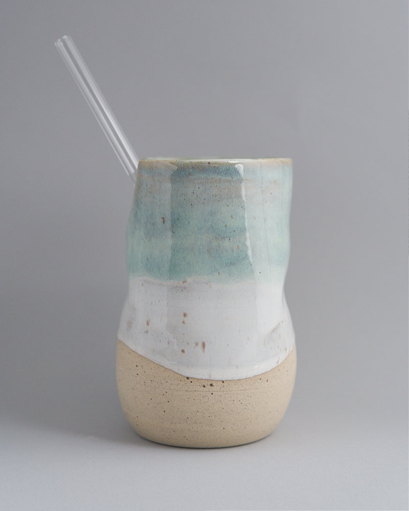 Cold drink cups that include glass straws. Hand made cups that include hand rest indentations allowing a comfortable grip when using them.